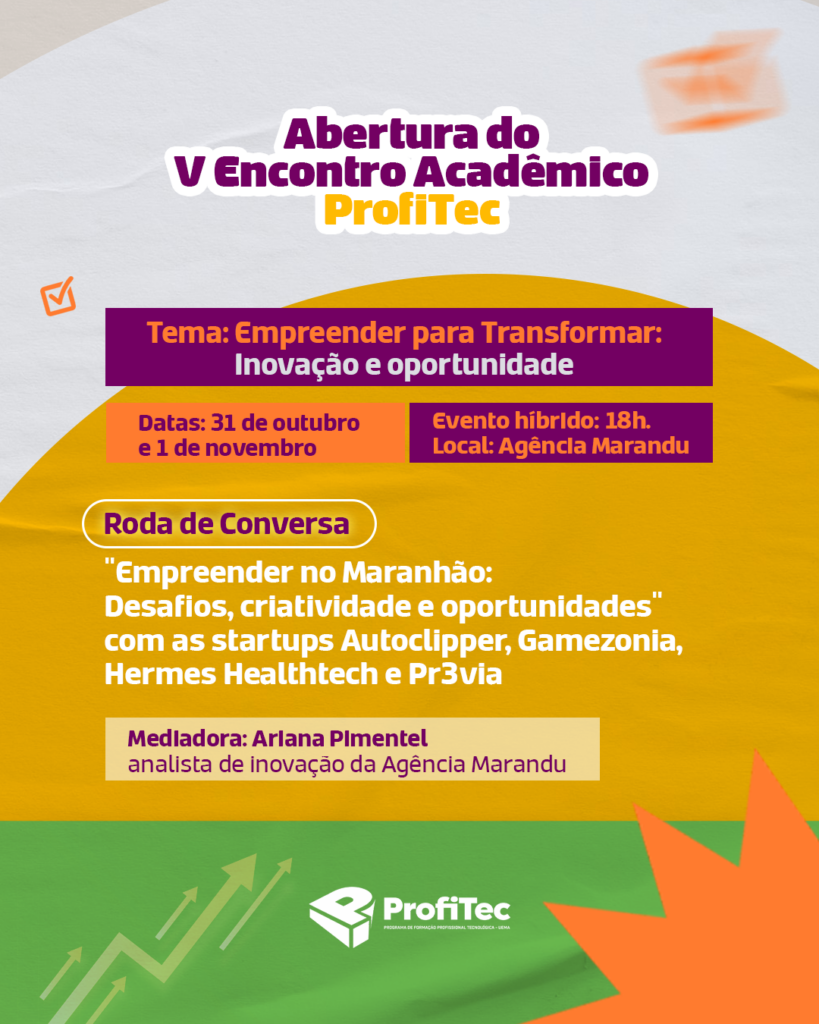 A cerimônia de abertura reunirá gestores, professores e convidados. Logo em seguida, às 19h, acontece a Roda de Conversa “Empreender no Maranhão: Desafios, Criatividade e Oportunidades”, mediada por Ariana Pimentel, analista de Inovação da Agência Marandu/UEMA.