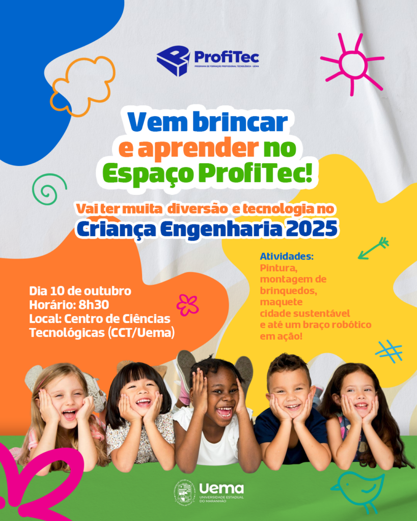 O Programa de Formação Profissional Tecnológica (ProfiTec) vai marcar presença no evento do projeto “Criança Engenharia 2025”, que acontece no dia 10 de outubro, a partir das 8h30, no Campus Paulo VI, da Universidade Estadual do Maranhão (Uema)