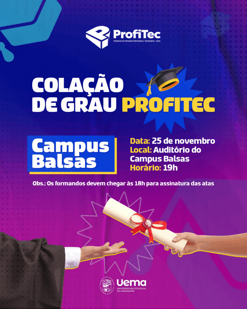 A Universidade Estadual do Maranhão (Uema) realizará amanhã(25) a cerimônia de colação de grau dos concluintes do Curso Superior de Tecnologia em Agrocomputação, ofertado pelo Programa de Formação Profissional Tecnológica (ProfiTec), no Campus Balsas.