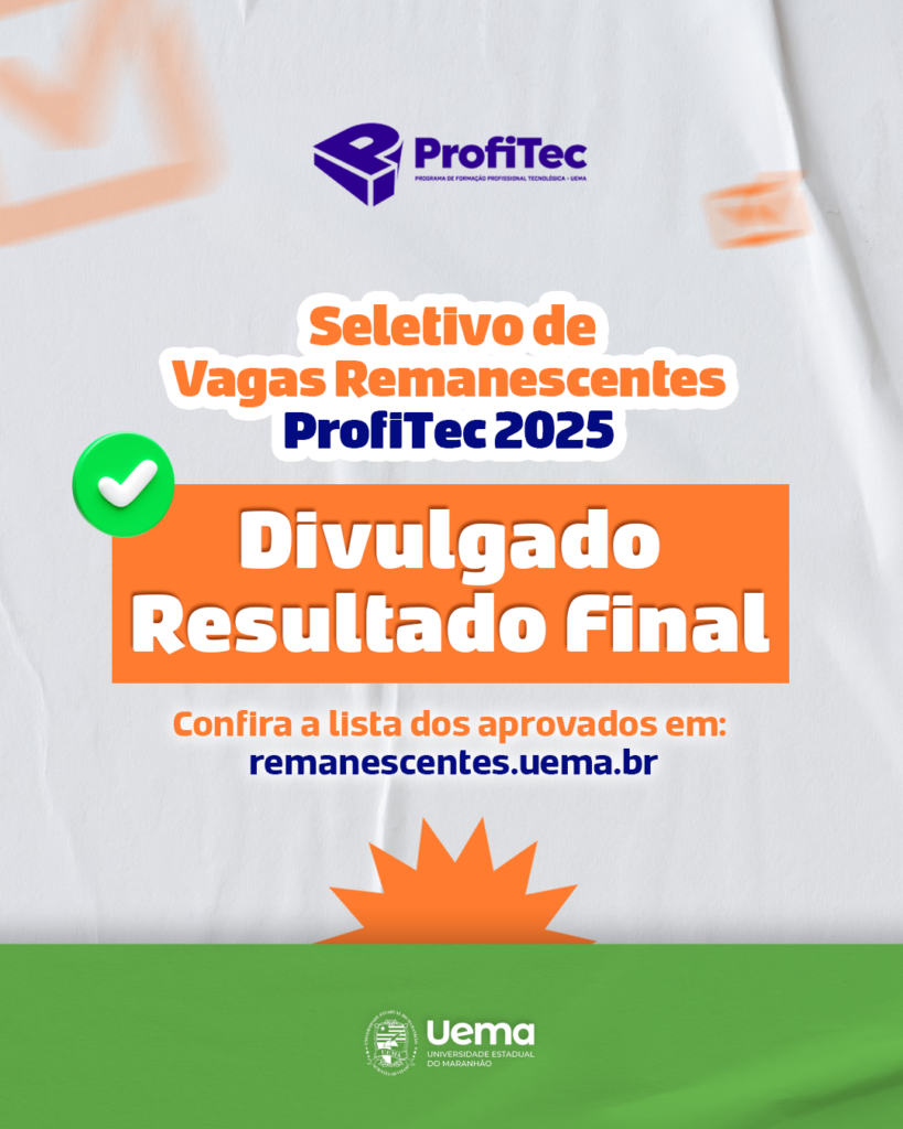 A Universidade Estadual do Maranhão (Uema) divulgou, nesta segunda-feira (3), o resultado final do Processo Seletivo Simplificado de Vagas Remanescentes do Programa de Formação Profissional Tecnológica (ProfiTec) 2025.