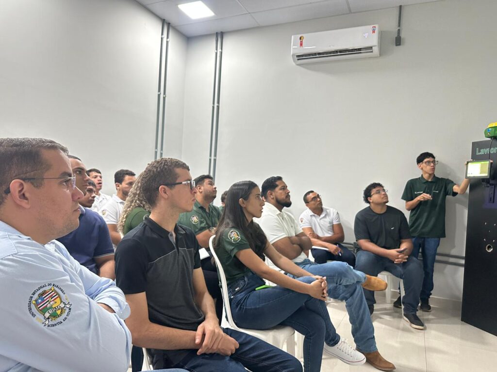 Os estudantes foram recebidos pelo funcionário Eduardo Arouche e pela equipe responsável pelo treinamento técnico em tecnologias, que apresentaram as plataformas digitais da John Deere e demonstraram, de forma prática, como essas ferramentas são aplicadas no dia a dia das propriedades rurais e das operações mecanizadas.