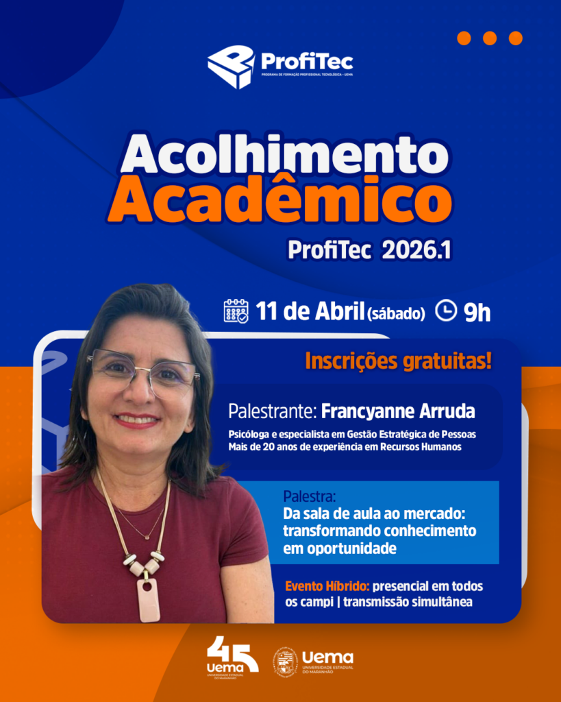 O Programa de Formação Profissional Tecnológica (Profitec), da Universidade Estadual do Maranhão, promove, no dia 11 de abril, às 9h, o evento “Acolhimento Profitec 2026.1.
